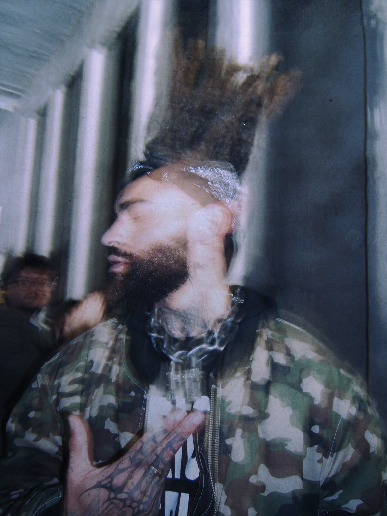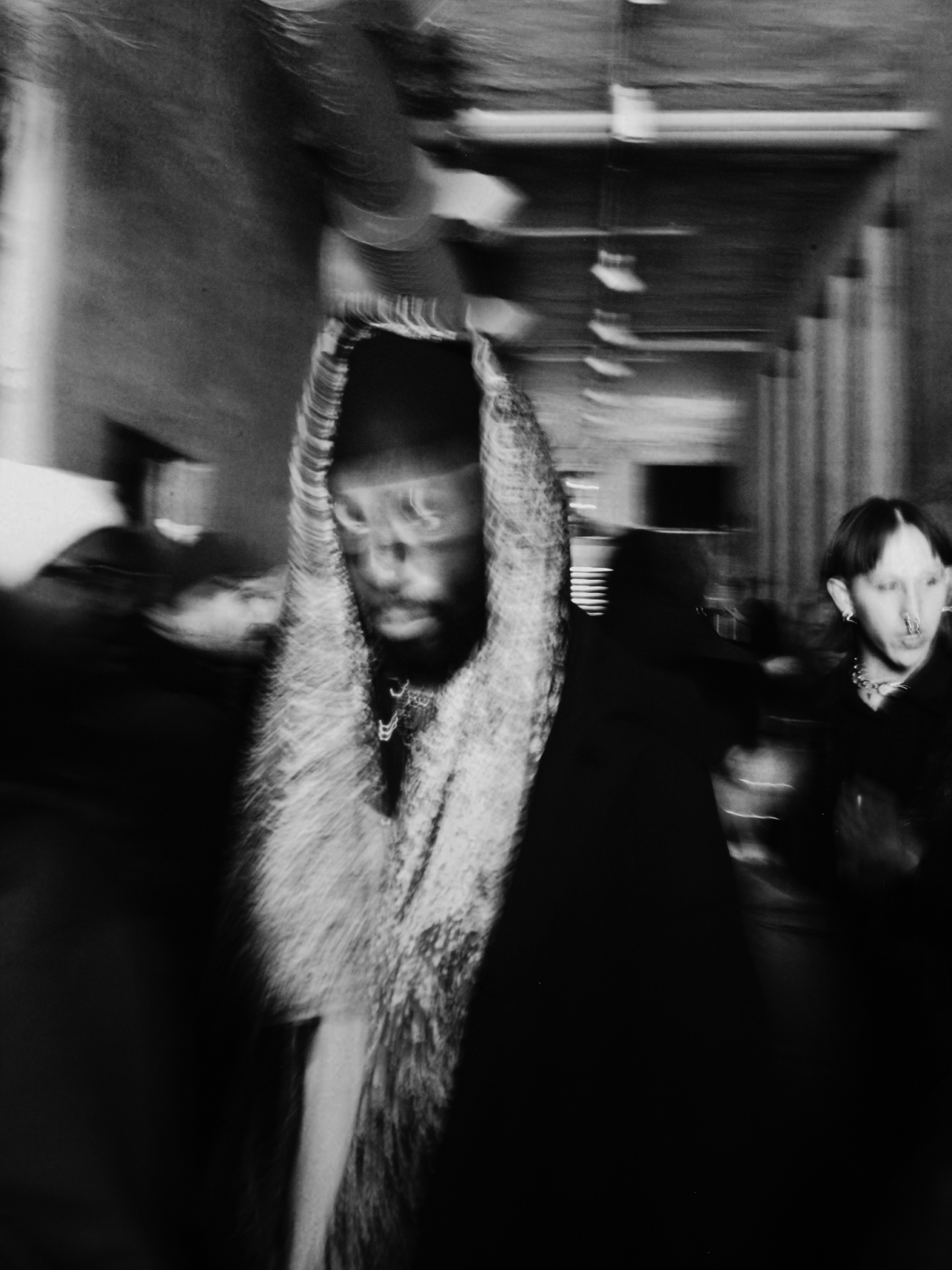 A South Side Chicago native and current resident of Florence, Italy, Stokes is a classically trained painter, multi-instrumentalist musician, and performance artist who has cultivated a global following through staging, recording and posting his unannounced performances in iconic public spaces from the Eiffel Tower to the Brooklyn Bridge to the White House, often capturing the live reactions of unexpectant spectators. Frequently labeled a “viral artist” by publications and self-described as a “performance athlete,” Stokes’ practice aims to collapse the boundaries between sound, movement, visual art, and endurance. Central to his work is an ongoing interrogation of Blackness as a lived and embodied condition, with visible influences from the works of Kerry James Marshall and David Hammons. Though his art has circulated widely online since his teenage years, this evening marked the first time audiences were invited to experience his performance work with advance notice and shared expectation.